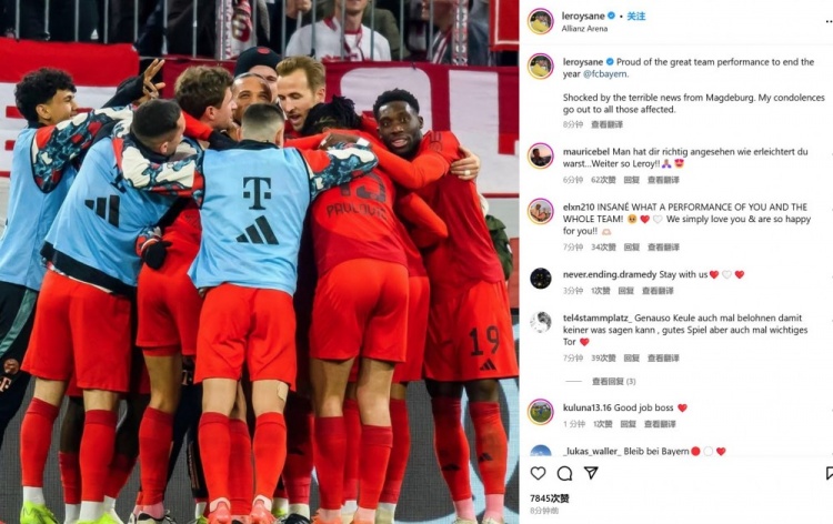 他也在赛后通过社媒晒出自己进球后被全队簇拥的照片,并表示:“很自豪全队能以如此出色表现为今年收官@拜仁俱乐部。”