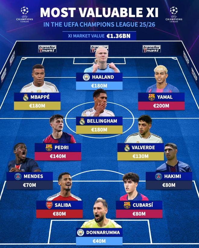 北京时间9月17日,在新赛季欧冠正式打响的情况下,德转也列出了2025-26赛季欧冠参赛球员的最贵11人阵容,亚马尔以2亿欧元的身价领衔,巴塞罗那和皇家马德里各有3名球员入选,曼城和巴黎圣日耳曼各2人,阿森纳1人。