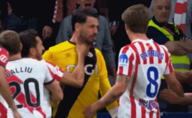 第49分钟,略伦特禁区里倒地,对方门将上前质疑他假摔。双方球员发生言语上的冲突。在此过程中,科克用手掐住对方门将的脖子,后者随即倒在地上。裁判向科克出示黄牌,马竞逃过一劫。