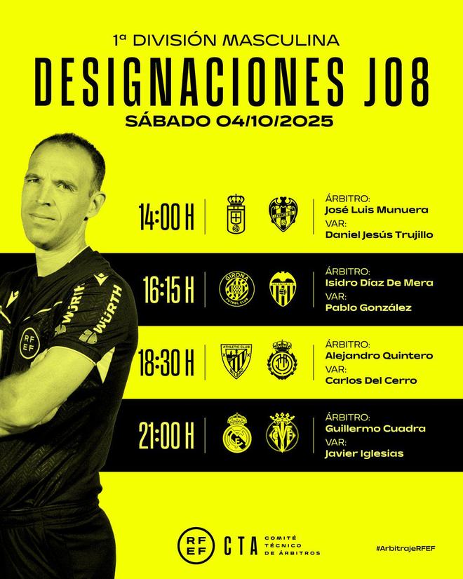 雷速体育10月3日讯 西甲官方公布了当地时间10月4日四场西甲联赛的裁判安排,吉列尔莫·夸德拉主哨皇马对阵比利亚雷亚尔的比赛。