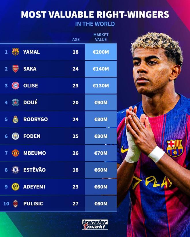 在完成最新一次身价更新后,德国转会市场网站列出了世界足坛右边锋身价榜,亚马尔以2亿欧居首,萨卡以1.4亿欧排名第二。